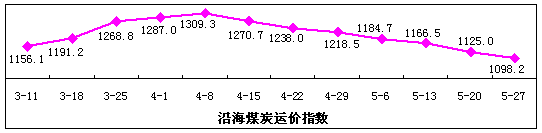 運(yùn)價(jià) 本周,煤炭需求仍未見(jiàn)明顯回升,運(yùn)輸市場(chǎng)創(chuàng)出新低,沿海煤炭貨種運(yùn)價(jià)指數(shù)報(bào)收于1098.2點(diǎn),較上周下降2.39%。主要航線煤炭運(yùn)價(jià)繼續(xù)下跌,其中秦皇島—廣州煤炭航線市場(chǎng)運(yùn)價(jià)為31元/噸,較上周下跌3元/噸;秦皇島—寧波為27元/噸,較上周下跌2元/噸。