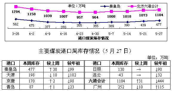 庫(kù)存 截至5月27日,北方六港(不包括黃騅港)煤炭庫(kù)存1104.3萬(wàn)噸,較上周增加31.3萬(wàn)噸,增長(zhǎng)2.9%。受遷曹鐵路檢修影響,京唐港煤炭庫(kù)存增幅減緩。廣州港方面,近期煤炭庫(kù)存處于較高位運(yùn)行,煤炭存港超期,堆存費(fèi)加大,中間商為緩解資金壓力,有可能采取降價(jià)等措施出清庫(kù)存。