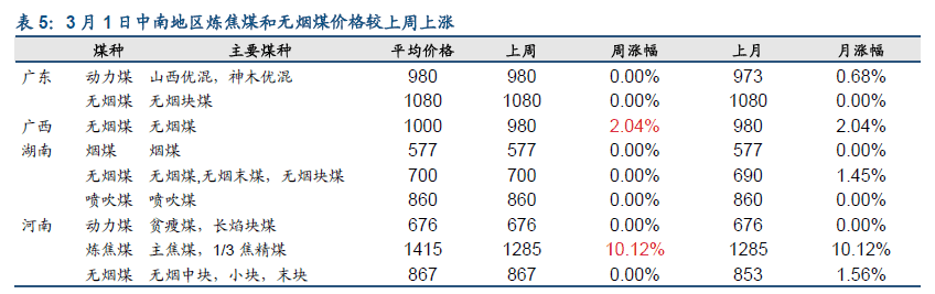 3 月1日中南地區(qū)煉焦煤和無(wú)煙煤價(jià)格較上周上漲