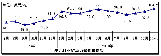 BJ指數(shù) 受寒冬預(yù)期影響,國(guó)際動(dòng)力煤價(jià)格繼續(xù)反彈,截至11月4日,澳大利亞BJ標(biāo)準(zhǔn)動(dòng)力煤價(jià)格指數(shù)報(bào)價(jià)為104.2美元/噸,比上周上漲2.58美元/噸。
