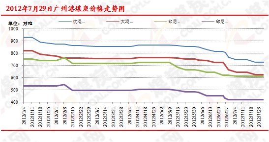 本周華南地區(qū)煤炭市場暫時維穩(wěn),港口庫存增加,內(nèi)貿(mào)動力煤價格有所下調(diào)。本周北方港口動力煤價格繼續(xù)下調(diào),下調(diào)幅度有所減少,有企穩(wěn)態(tài)勢。其中秦皇島港Q5800大卡平倉價695-705元/噸,周環(huán)比下降10元;Q5500大卡平倉價625-635元/噸,周環(huán)比維持不變;Q5000大卡平倉價525-535元/噸,周環(huán)比下降5元;Q4500平倉價430-440元/噸,周環(huán)比下降5元。截止到7月26日,港口共存煤840.5萬噸。受南方地區(qū)電廠趕在臺風到來之前到港運煤,港口庫存減少,供需暫時保持平衡,成交順暢。截止到7月20日,我國主要六大電廠總庫存量為1547.6萬噸,日耗量為60.92萬噸,可用天數(shù)為25天左右,夏季用煤高峰和用電高峰的來到,電廠拉煤的積極性有所恢復。本周華南地區(qū)煉焦煤市場繼續(xù)呈現(xiàn)弱勢穩(wěn)定態(tài)勢,無煙煤弱勢維穩(wěn),港口報價混亂現(xiàn)象依舊。