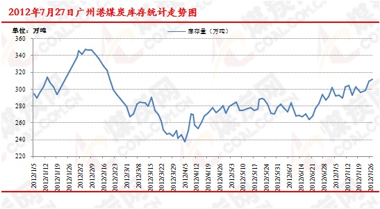 港口庫存方面:煤炭網(wǎng)信息研究中心數(shù)據(jù)顯示,截止到7月27日,廣州港存煤311.55萬噸,周環(huán)比增加15.33萬噸。其中新沙公司存煤176萬噸;環(huán)比增加11萬噸;西基公司存煤51萬噸,環(huán)比保持不變;新港公司存煤14.84萬噸,環(huán)比增加1.2萬噸;黃埔公司存煤69.7萬噸,環(huán)比增加3.2萬噸。