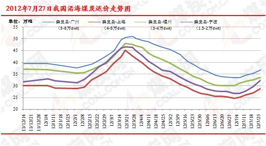 沿海運費:本周國內(nèi)沿海煤炭運費小幅回升,其中短途運費回升較快。截止到7月27日,秦皇島-廣州(5-6萬DWT)運價36.8元/噸,周環(huán)比回升1.5元;秦皇島-福州(3-4萬DWT)運價33.6元/噸,周環(huán)比回升1.2元;天津-上海(2-3萬DWT)運價30.4元/噸,周環(huán)比回升2.1元;天津-鎮(zhèn)江(1-1.5萬DWT)運價37.7元/噸,周環(huán)比回升2.6元;秦皇島-寧波(1.5-2-6萬DWT)運價32.3元/噸,周環(huán)比回升2.6元。近期重點發(fā)電集團電煤庫存較6月份的庫存高點回落180萬噸左右,隨著迎峰度夏的展開,下游耗煤企業(yè)再次派船拉煤的積極性有所提高,沿海航運市場船舶運力需求有所增加。目前在港口錨地船舶數(shù)量較前期有所增多。