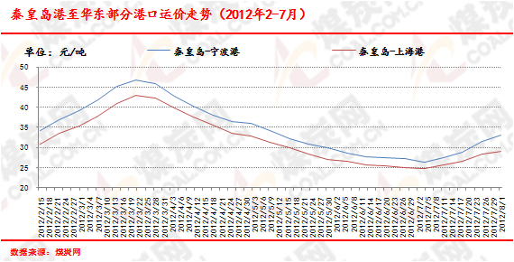 華東沿海煤炭運輸市場繼續(xù)小幅反彈,自7月27日至8月3日,秦皇島港至寧波港(1.5-2萬噸)煤炭海運費漲1.1元/噸至33.4元/噸;秦皇島港至上海港(4-5萬噸)煤炭運費微漲0.3元/噸至29.1元/噸;秦皇島港至張家港(2-3萬噸)煤炭運費漲1.3元/噸至34.1元/噸。