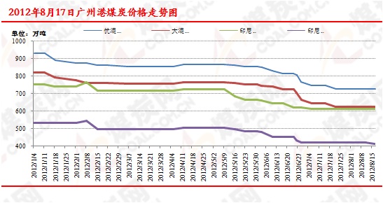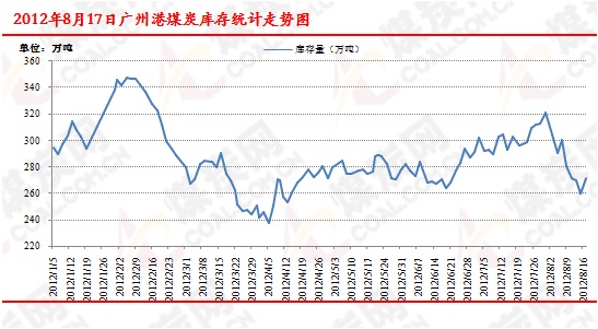 本周華南地區(qū)煤炭市場運行穩(wěn)定,港口主流煤種價格已經連續(xù)三周保持穩(wěn)定,下游電廠發(fā)電負荷量也上升至70%左右。受上游秦皇島港煤價企穩(wěn)有初步回暖跡象的影響,廣州港口主動詢價有采購意愿的用戶增多,但是實際成交情況仍然較少。港口庫存前期下降較快,目前又呈現(xiàn)反彈的趨勢。目前北方港口秦皇島港動力煤價格再次企穩(wěn),其中Q5800大卡平倉價680-690元/噸,周環(huán)比下降5元;Q5500大卡平倉價620-630元/噸,周環(huán)比保持不變;Q5000大卡平倉價525-535元/噸,周環(huán)比不變;Q4500平倉價430-440元/噸,周環(huán)比上漲5元。本周市場上Q5000大卡以及Q4500大卡兩種低質動力煤交易價格和交易數(shù)量的漲勢更加明顯。有業(yè)內人士分析道是由于大型煤企高熱值動力煤投放市場量增多,市場就增加低卡配煤用來降低成本。截止到8月17日,港口共存煤673.3萬噸,港口存煤下降較快,主要還是由于近期晉、陜、蒙等主要產煤地自發(fā)的限產、停產;其次7月份進口量的繼續(xù)減少;以及下游市場補庫存的意愿增強,動力煤價格企穩(wěn)帶來的市場信心恢復等等,庫存的快速下降有利于進一步對動力煤價格形成支撐。本周華南地區(qū)連焦煤市場弱勢穩(wěn)定,下游市場依然成交較弱。無煙煤市場弱勢穩(wěn)定,周邊電廠負荷量仍是低位運行。