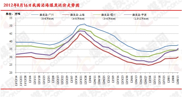 沿海運費:本周國內沿海煤炭運費繼續(xù)呈現(xiàn)小幅回升趨勢,不過短途運費上漲幅度有增加的趨勢。截止到8月17日,秦皇島-廣州(5-6萬DWT)運價37.8元/噸,周環(huán)比上漲0.5;秦皇島-福州(3-4萬DWT)運價34.6元/噸,周環(huán)比回升0.2元;天津-上海(2-3萬DWT)運價32.5元/噸,周環(huán)比回升0.7元;天津-鎮(zhèn)江(1-1.5萬DWT)運價40.8元/噸,周環(huán)比回升1.3元;秦皇島-寧波(1.5-2-6萬DWT)運價35.6元/噸,周環(huán)比回升1.2元。受前期臺風“?庇绊懚\輸受阻的南方航線恢復運輸,運費呈現(xiàn)上漲的趨勢,其中華東地區(qū)運費漲幅較大。近期華東地區(qū)氣溫偏高,電廠日耗煤量增加,電廠補庫存意愿增強刺激了沿海運輸市場的活躍,海運費出現(xiàn)逐步回升。