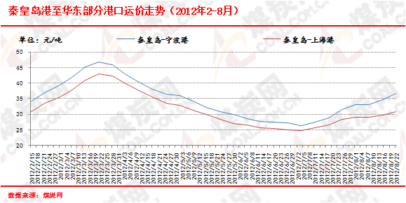 華東沿海煤炭運輸市場繼續(xù)上漲(如下圖),自8月17日至8月24日,秦皇島港至寧波港(1.5-2萬噸)煤炭海運費漲2.6元/噸至38.2元/噸;秦皇島港至上海港(4-5萬噸)煤炭運費微漲1.8元/噸至31.8元/噸;秦皇島港至張家港(2-3萬噸)煤炭運費略漲2.7元/噸至38.6元/噸。