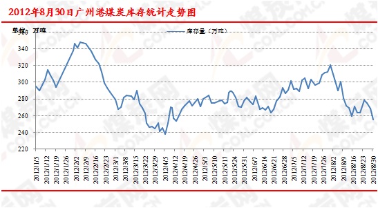 截止到8月30日,廣州港存煤255.43萬噸,較上周同期相比減少5.65萬噸。本周港口煤炭庫存持續(xù)減少,主要由于進口量的減少造成港口存煤下降。