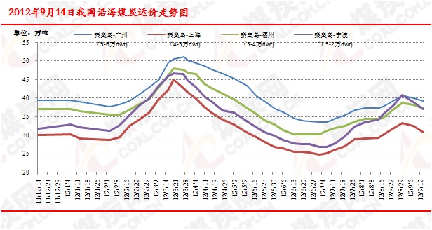 沿海運(yùn)費(fèi):截止到9月14日,現(xiàn)秦皇島港-廣州港(5-6萬(wàn)DWT)運(yùn)費(fèi)39.1元/噸,周環(huán)比下跌0.9元;秦皇島-福州(3-4萬(wàn)DWT)運(yùn)費(fèi)37.1元/噸,周環(huán)比下跌1元。天津-上海(2-3萬(wàn)DWT)運(yùn)價(jià)34.6元/噸,周環(huán)比回落1.5元;天津-鎮(zhèn)江(1-1.5萬(wàn)DWT)運(yùn)價(jià)43.5元/噸,周環(huán)比回落0.3元;秦皇島-寧波(1.5-2萬(wàn)DWT)運(yùn)價(jià)36.9元/噸,周環(huán)比回落2元。華南航線因前期漲幅較小,因此目前價(jià)格仍比較堅(jiān)挺,跌幅較小。近期,下游電廠日耗維持低位運(yùn)行,只是電廠存煤水平有所上升,下游采購(gòu)熱情有所下降。目前航運(yùn)市場(chǎng)運(yùn)價(jià)受市場(chǎng)制約影響明顯,觀望情緒蔓延,不過(guò)后期隨著大秦線檢修日子的確定,以及冬儲(chǔ)煤的進(jìn)行,下游耗煤企業(yè)對(duì)電煤的需求將會(huì)有所上升,從而帶動(dòng)航運(yùn)市場(chǎng)的回暖,預(yù)計(jì)后期沿海運(yùn)價(jià)將會(huì)有所回暖。