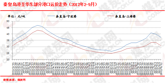 華東沿海煤炭運(yùn)輸市場(chǎng)下行趨勢(shì)延續(xù),自9月7日至9月14日,秦皇島港至寧波港(1.5-2萬噸)煤炭海運(yùn)費(fèi)再降2元/噸至36.9元/噸;秦皇島港至上海港(4-5萬噸)煤炭運(yùn)費(fèi)再降1.8元/噸至30.7元/噸;秦皇島港至張家港(2-3萬噸)煤炭運(yùn)費(fèi)降1.9元/噸至37.8元/噸。國(guó)內(nèi)動(dòng)力煤市場(chǎng)略有好轉(zhuǎn)跡象,加上大秦線檢修、冬儲(chǔ)煤等因素支撐北方港口動(dòng)力煤價(jià)格持續(xù)微漲,航運(yùn)市場(chǎng)運(yùn)力恢復(fù)并增加,而實(shí)際的電廠采煤需求仍在低位,造成航運(yùn)市場(chǎng)供大于求,運(yùn)價(jià)無實(shí)際需求支撐而走跌。