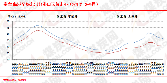 華東沿海煤炭運(yùn)輸市場(chǎng)低位運(yùn)行,運(yùn)價(jià)跌幅較上期大幅收窄,自9月14日至9月21日,秦皇島港至寧波港(1.5-2萬噸)煤炭海運(yùn)費(fèi)微降0.8元/噸至36.1元/噸;秦皇島港至上海港(4-5萬噸)煤炭運(yùn)費(fèi)微降0.3元/噸至30.4元/噸;秦皇島港至張家港(2-3萬噸)煤炭運(yùn)費(fèi)降0.9元/噸至36.9元/噸。國(guó)內(nèi)動(dòng)力煤市場(chǎng)繼續(xù)呈現(xiàn)好轉(zhuǎn)跡象,加上大秦線檢修、冬儲(chǔ)煤等因素支撐北方港口動(dòng)力煤價(jià)格持續(xù)微漲,沿海航運(yùn)市場(chǎng)活躍度略增,運(yùn)價(jià)大幅下跌的可能性不大。
