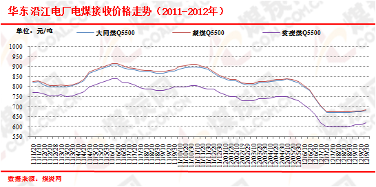 最新數(shù)據(jù)顯示,2012年9月下旬,華東沿江電廠電煤接收價格繼9月中旬期平穩(wěn)后本期出現(xiàn)上漲,其中,太倉華能、南通華能、上海石洞二電廠接收5000、5500大卡大同煤分別上漲10元/噸、5元/噸至590元/噸、680元/噸,接收5800大卡大同煤價格較中旬持穩(wěn)在730元/噸;夏港電廠、揚州二電接收5000、5500大卡蒙煤價格分別漲10元/噸、5元/噸至595元/噸、685元/噸;上海石洞一、天生港電廠接收5000、5500大卡貧瘦煤價格均上漲10元/噸,現(xiàn)分別為570元/噸、620元/噸。