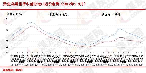 國內(nèi)沿海煤炭運(yùn)輸市場繼續(xù)下跌,華東段跌幅明顯,自10月8日至10月12日,秦皇島港至寧波港(1.5-2萬噸)煤炭海運(yùn)費(fèi)下降1.1元/噸至31.7元/噸;秦皇島港至上海港(4-5萬噸)煤炭運(yùn)費(fèi)降0.4元/噸至27.8元/噸;秦皇島港至張家港(2-3萬噸)煤炭運(yùn)費(fèi)降0.6元/噸至33.8元/噸。前期海運(yùn)費(fèi)上漲 ,加上近期冬儲季節(jié)沿海煤炭市場稍有活躍,之前停泊的船只紛紛復(fù)航,運(yùn)力恢復(fù),船舶市場供給過剩拉低運(yùn)價。