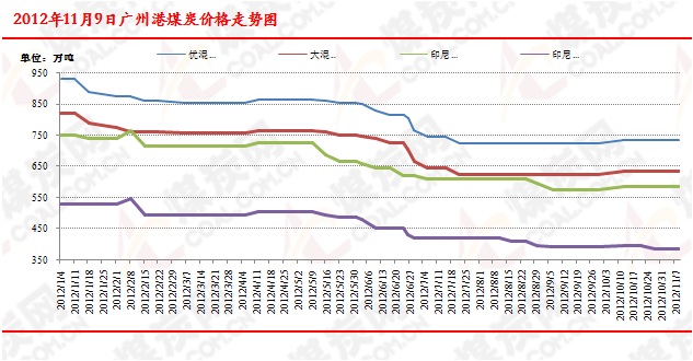 本周華南地區(qū)煤炭市場平穩(wěn)運行,港口存煤增加,內外貿煤炭價格保持平穩(wěn)。港口外貿印尼煤庫存堆積部分熱量煤價格下跌10-20元/噸,受國內煤炭價格下跌拖累影響,中國貿易商采購印尼煤炭較少,已經沒有什么利潤可圖,預計后期印尼煤市還有下跌的可能。本周北方港口動力煤價格指數較前一期保持不變,該指數也是動力煤連漲九周以后首次出現平穩(wěn)。目前北方港口Q5800大卡平倉價680-690元/噸;Q5500大卡平倉價635-645元/噸;Q5000大卡平倉價555-565元/噸;Q4500平倉價455-465元/噸。近期我國出現的降溫、降雪天氣以及十八大煤礦停產安檢等影響對國內動力煤市場供求和消費產生了一定的支持作用,但是煤炭的高庫存問題也再度凸顯,成為影響近期動力煤供求和制約該地區(qū)動力煤價格回升的主要因素。目前下游企業(yè)庫存依然處于較高狀態(tài),電力企業(yè)電煤采購的積極性有所下降,再加上港口煤炭庫存的持續(xù)回升,這都將迫使沿海地區(qū)煤炭供求活躍度下降。本周華南地區(qū)煉焦煤市場生產運行情況穩(wěn)定,受上游鋼焦企業(yè)向好影響,市場成交活躍,預計后期煉焦煤市場仍舊平穩(wěn)運行。本周華南地區(qū)無煙煤市場運行偏穩(wěn),出庫以抵消為主,煤炭價格穩(wěn)定。預計后期無煙煤市場平穩(wěn)運行。