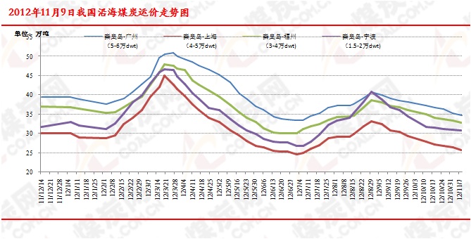 沿海運費:截止到11月9日,現秦皇島港-廣州港(5-6萬DWT)運費34.7元/噸,較2日下跌0.6元;秦皇島-福州(3-4萬DWT)運費32.8元/噸,下跌0.6元。天津-上海(2-3萬DWT)運價29.5元/噸,回落0.2元;天津-鎮(zhèn)江(1-1.5萬DWT)運價35.6元/噸,回落0.3元;秦皇島-寧波(1.5-2萬DWT)運價30.8元/噸,下降0.1元。截止到11月9日沿海六大電廠存煤總量為1387.1萬噸,周環(huán)比減少22.37萬噸;存煤可用天數為22.22天,較上周同期減少1.84天。本期沿海煤炭運價出現企穩(wěn)跡象,但是由于上漲動力不足,利好因素難以支撐運價回升。主要由于前期沿海運價已經連續(xù)下跌2月,運價已經跌至船東心理底線。長時間的低位運價迫使部分船東選擇停運或者進行船舶檢修,造成市場運力短暫回避、運價緩慢筑底。另一方面由于氣溫的偏低使得沿海地區(qū)對下水煤炭的需求有所提高,增加對北方煤炭或進口煤炭的采購動作,增強運價上漲預期。綜合分析認為隨著冬儲煤的進行,下游企業(yè)煤炭庫存持續(xù)偏高,以及日耗偏低的特征影響,又使得沿海運輸受阻,制約著運價的回暖,目前航運市場供大于求的現象依然存在,預計后期沿海運價將繼續(xù)受到壓制。
