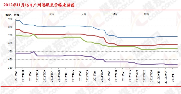 【動(dòng)力煤市場(chǎng)】本周廣州港煤炭市場(chǎng)穩(wěn)定運(yùn)行,港口存煤繼續(xù)呈現(xiàn)增長(zhǎng)態(tài)勢(shì),逼近300萬(wàn)噸。內(nèi)外貿(mào)煤炭?jī)r(jià)格繼續(xù)持穩(wěn),沒(méi)有明顯變化。 印尼煤炭市場(chǎng)受上周價(jià)格下跌的影響,成交情況并沒(méi)有有所提升。隨著北方動(dòng)力煤市場(chǎng)價(jià)格的下跌,沿海動(dòng)力煤市場(chǎng)的持續(xù)低迷,加上進(jìn)口印尼煤的價(jià)格優(yōu)勢(shì)在國(guó)內(nèi)已逐漸變?nèi),年底前?guó)內(nèi)煤炭?jī)r(jià)格回升的幾率較小。截止到11月16日,廣州港存煤297.89萬(wàn)噸,較上周同期上漲19.17萬(wàn)噸,F(xiàn)港口內(nèi)貿(mào)煤炭?jī)r(jià)格維持穩(wěn)定,其中山西優(yōu)混5500大卡港口庫(kù)提價(jià)725元/噸,山西大混山5000大卡港口庫(kù)提價(jià)630-640元/噸;大混4500大卡港口庫(kù)提價(jià)545-555元/噸。神木優(yōu)混1號(hào)Q5500A12V28S0.3港口庫(kù)提價(jià)750元/噸,神木塊煤Q6100A4V28S0.2港口庫(kù)價(jià)1020元/噸。外貿(mào)煤方面:現(xiàn)澳洲煤Q5000大卡港口庫(kù)提價(jià)610-620元/噸;Q5500大卡CIF價(jià)650元/噸;印尼煤Q4700大卡港口到岸參考價(jià)580-590元/噸,Q3800大卡港口庫(kù)提價(jià)380-390元/噸;越南洪基11AQ4800大卡港口庫(kù)提價(jià)600-610元/噸。截止到目前印尼至中國(guó)南部沿海的煤炭運(yùn)費(fèi)保持穩(wěn)定,目前印尼加里曼丹港-廣州港(5-6萬(wàn)噸)運(yùn)價(jià)8.5美元/噸,較上期下跌0.5美元,印尼加里曼丹港-廣州港(6-7萬(wàn)噸)運(yùn)價(jià)7.5美元/噸,較上期保持穩(wěn)定。