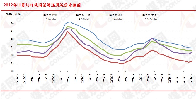 沿海運(yùn)費(fèi):截止到11月16日,現(xiàn)秦皇島港-廣州港(5-6萬(wàn)DWT)運(yùn)費(fèi)34.6元/噸,較9日下跌0.1元;秦皇島-福州(3-4萬(wàn)DWT)運(yùn)費(fèi)33元/噸,微漲0.2元。天津-上海(2-3萬(wàn)DWT)運(yùn)價(jià)30元/噸,回升0.5元;天津-鎮(zhèn)江(1-1.5萬(wàn)DWT)運(yùn)價(jià)37.3元/噸,回升1.7元;秦皇島-寧波(1.5-2萬(wàn)DWT)運(yùn)價(jià)31.8元/噸,回升1元。截止到11月16日沿海六大電廠存煤總量為1399萬(wàn)噸,周環(huán)比增加12萬(wàn)噸;存煤可用天數(shù)為22.35天,較上周同期增加0.13天。本期沿海煤炭運(yùn)價(jià)均出現(xiàn)弱勢(shì)回暖的局面,漲勢(shì)情況表現(xiàn)不一。一方面由于前期持續(xù)下跌的運(yùn)價(jià)已經(jīng)跌至船東的成本線上,運(yùn)價(jià)繼續(xù)下跌的空間有限,部分船東采取封航停運(yùn)來(lái)削減市場(chǎng)剩余運(yùn)力。另一方面,需求不足使得運(yùn)輸市場(chǎng)貨源減少,租船成交清淡,對(duì)運(yùn)價(jià)的上漲預(yù)期形成制約。本期運(yùn)價(jià)上漲主要集中在短途的小型船舶上面,大型運(yùn)輸船舶運(yùn)價(jià)繼續(xù)呈現(xiàn)弱勢(shì)下探,不過(guò)下探幅度已經(jīng)陸續(xù)縮小。目前沿海運(yùn)輸價(jià)格的上漲和下跌勢(shì)頭仍不明朗,預(yù)計(jì)近期運(yùn)價(jià)將呈現(xiàn)底部震蕩趨勢(shì),運(yùn)價(jià)的回暖要等到冬季用煤需求提升等利好因素的進(jìn)一步刺激。