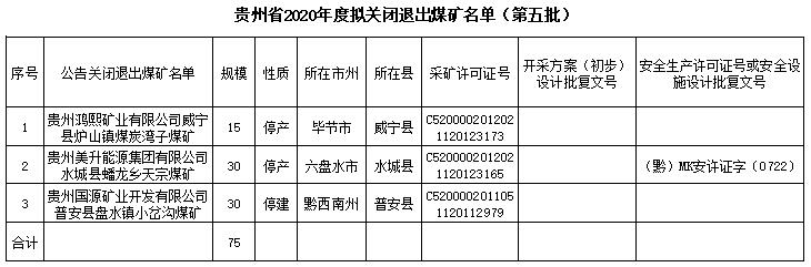 貴州省能源局日前發(fā)布貴州省2020年度第五批擬關(guān)閉煤礦名單,名單涉及煤礦3處,合計產(chǎn)能75萬噸。