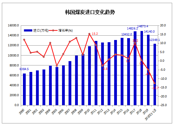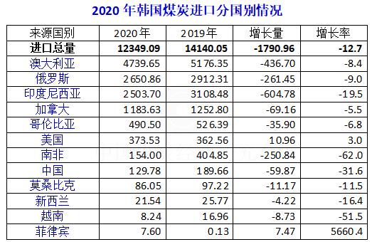 據(jù)韓國海關(guān)(Korea Customs Service -KCS)發(fā)布的統(tǒng)計(jì)數(shù)據(jù),2020年1-12月韓國煤炭進(jìn)口12349.1萬噸,同比減少1791萬噸,下降12.7%。