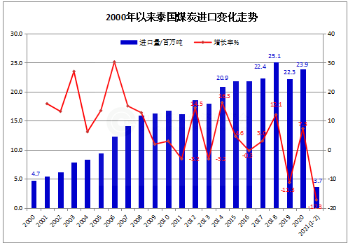 2021年2月,泰國煤炭進(jìn)口189.8萬噸,同比下降22.7%。其中,煙煤及無煙煤進(jìn)口188.4萬噸,同比下降21.8%;褐煤進(jìn)口1.4萬噸,同比下降67.7%。